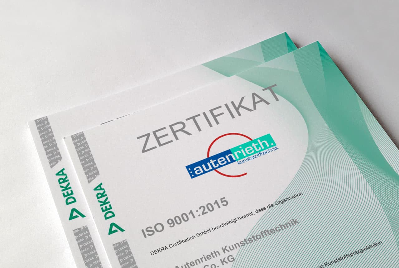Seit 22 Jahren steht die 1A Autenrieth Kunststofftechnik GmbH & Co. KG für die Einhaltung der höchsten Qualitätsstandards. Und das hat mindestens für die nächsten drei Jahre Bestand. Wir wurden von der DEKRA gemäß der gültigen Norm in den Bereichen Beratung, Werkzeugkonstruktion, Fertigung und Montage von Kunststoffspitzgießteilen bis 18.11.2024 zertifiziert.